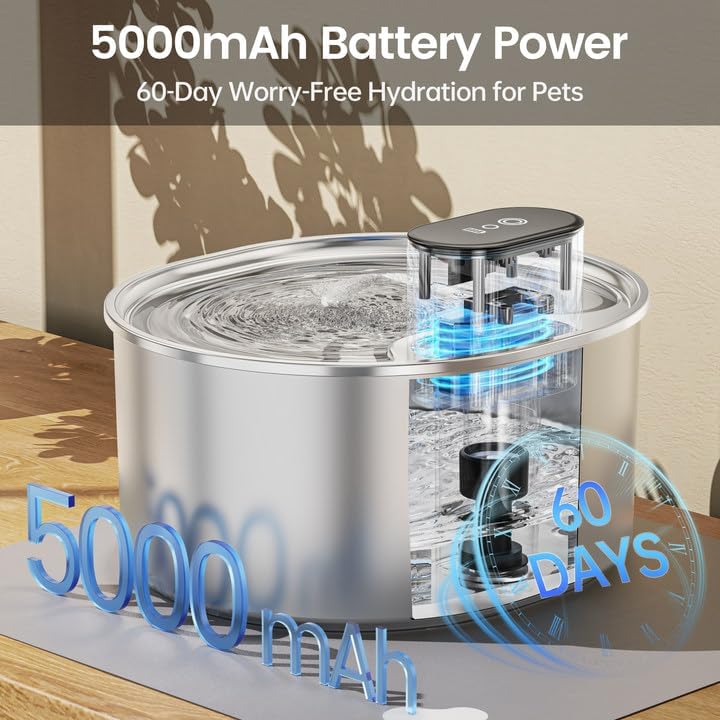 - 【Up to 90-Day Battery Life】5000 mAh powers this truly wireless cat fountain stainless steel through outages and travel.