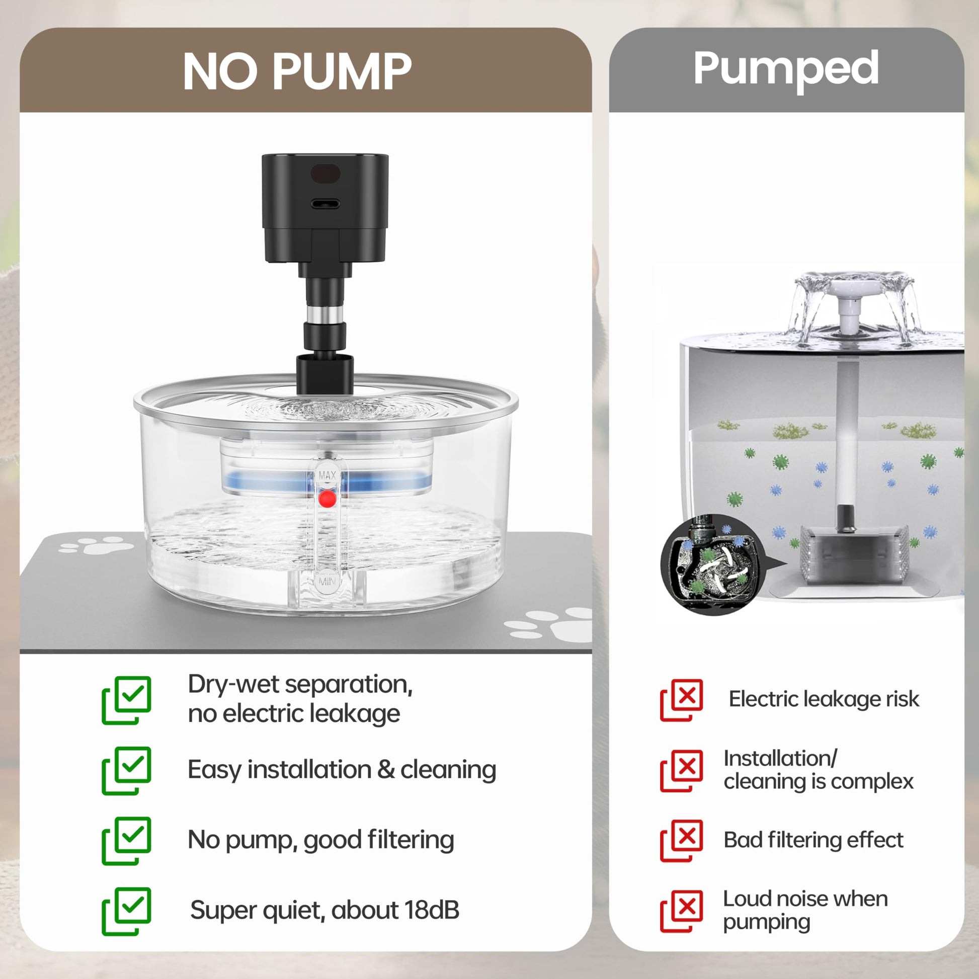 - 【Pumpless & Cordless Safety】Brushless drive with vacuum action; no exposed pump or wires near water. An ultra-quiet automatic cat water fountain ideal for bedrooms and apartments.